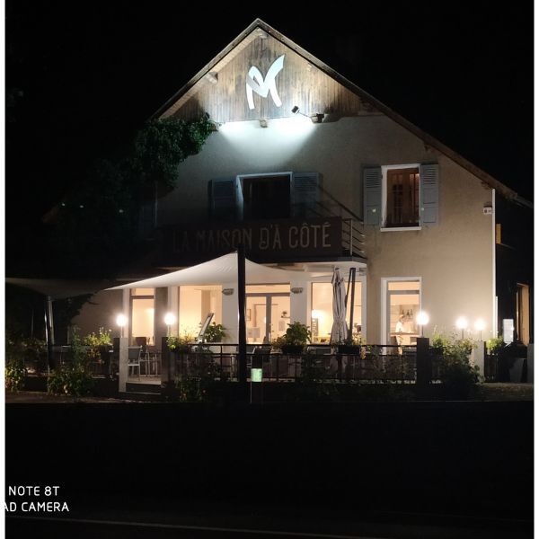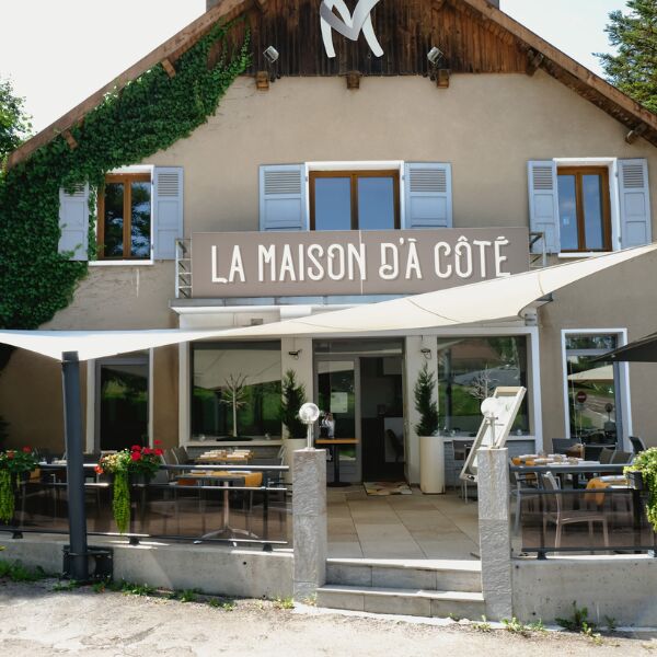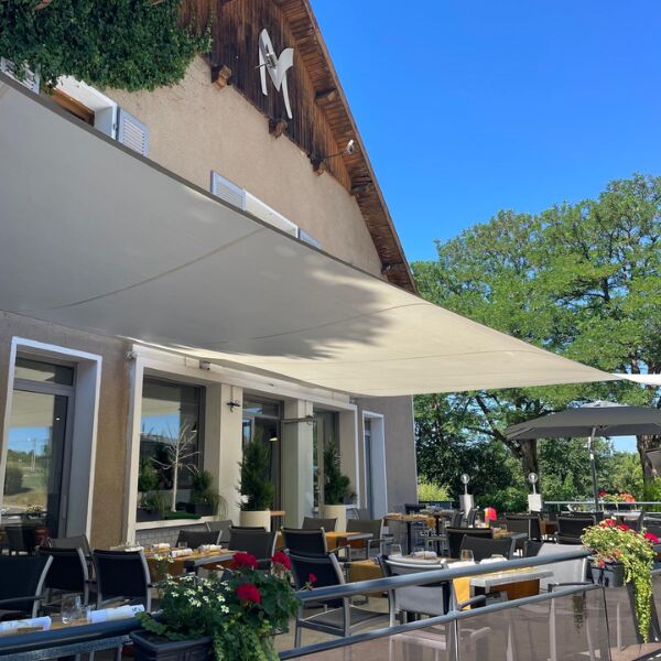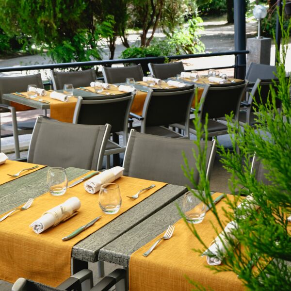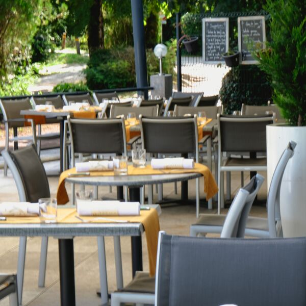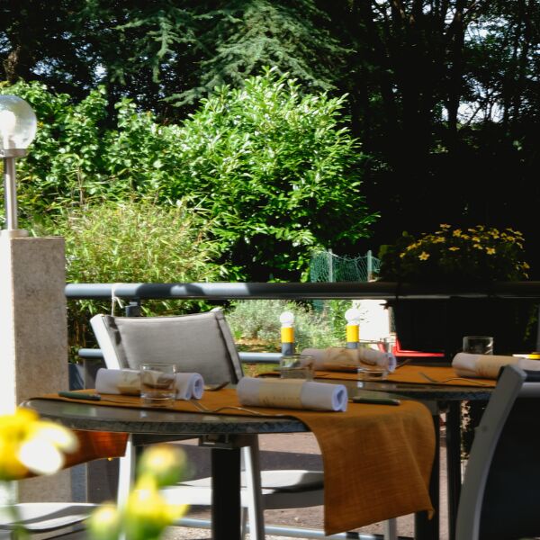 Aux beaux jours, une grande terrasse ombragée vous permet de partager votre repas en famille, entre amis, ou entre collègues.